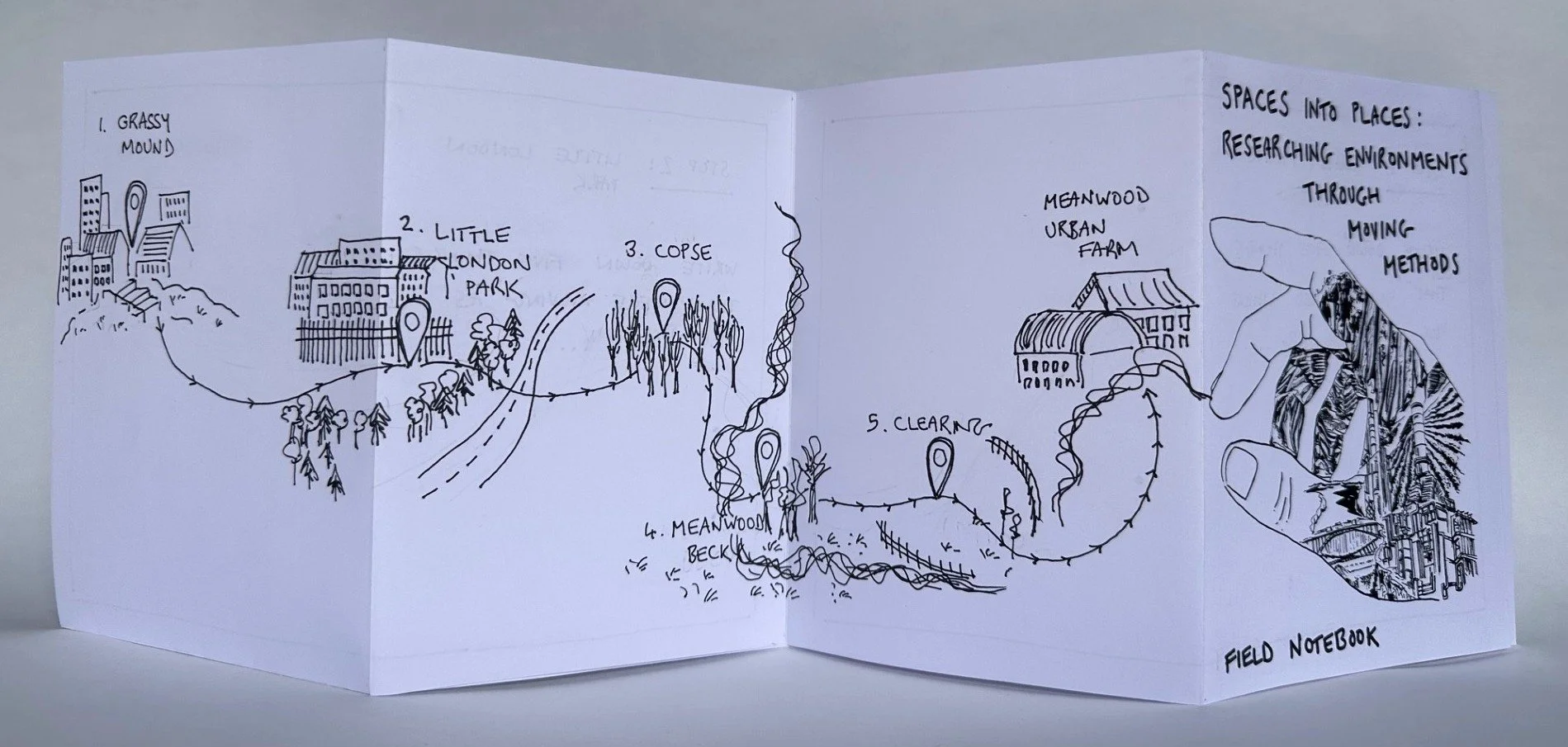 Spaces into Places was an interdisciplinary fieldwork event in which participants used a range of artistic research practices to explore the natural and post-industrial sites along Meanwood Beck in Leeds, UK.